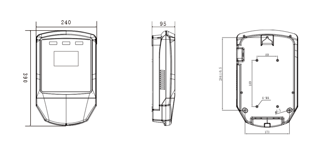 外观结构产品属性 运营版扫码7KW 设备尺寸 390mm*240mm*95mm(L*W*T) 安装方式 壁挂安装 走线方式 下进下出 线缆长度 5M