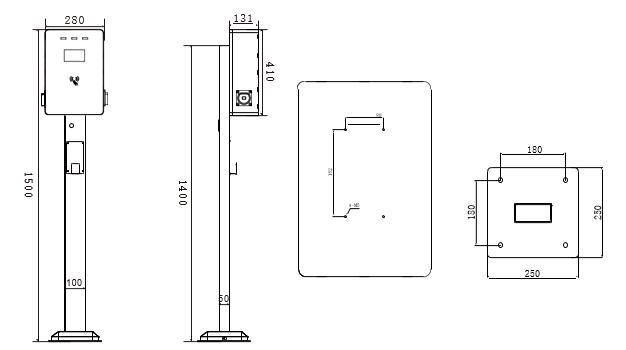 外观结构产品属性 钣金版双枪7KW 设备尺寸 410mm*280mm*131mm(L*W*T) 安装方式 地面开孔安装 走线方式 下进下出 线缆长度 5M